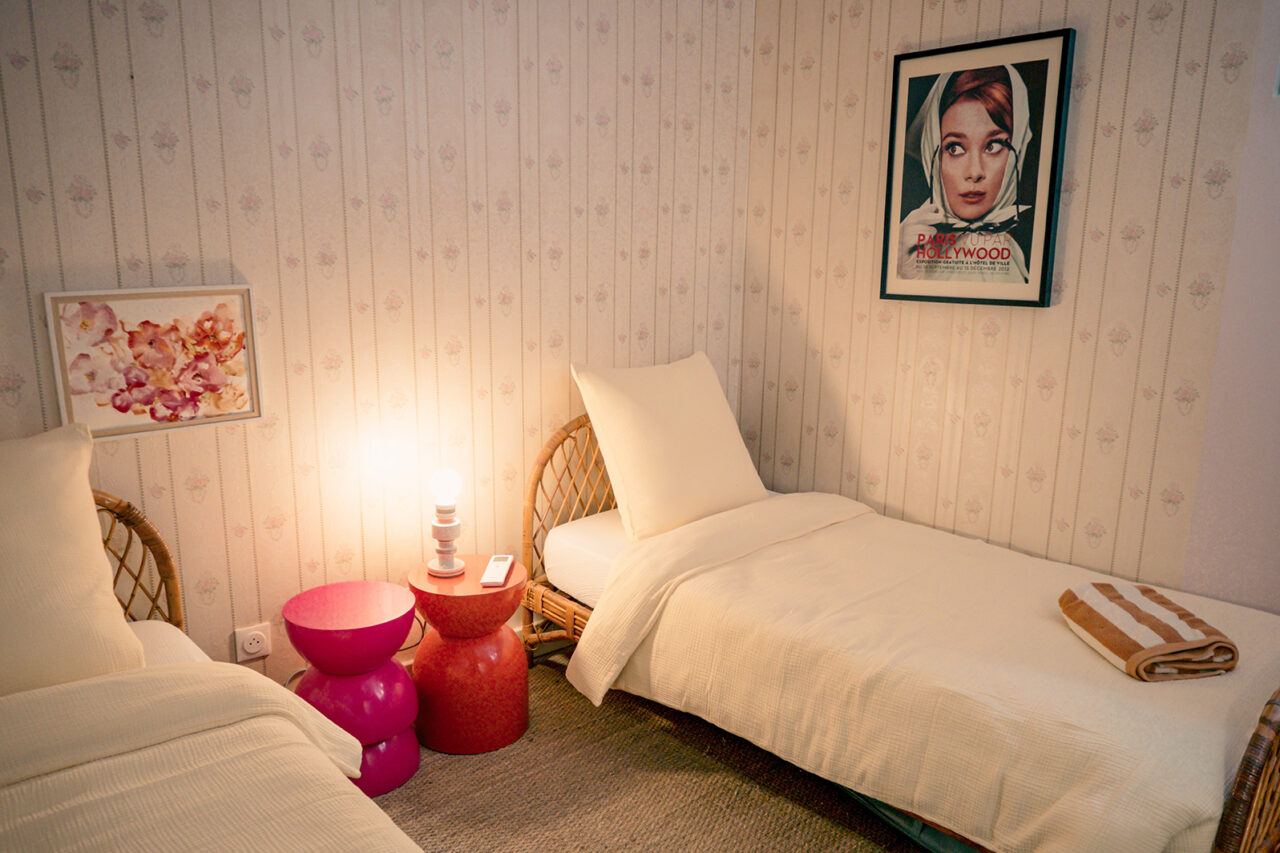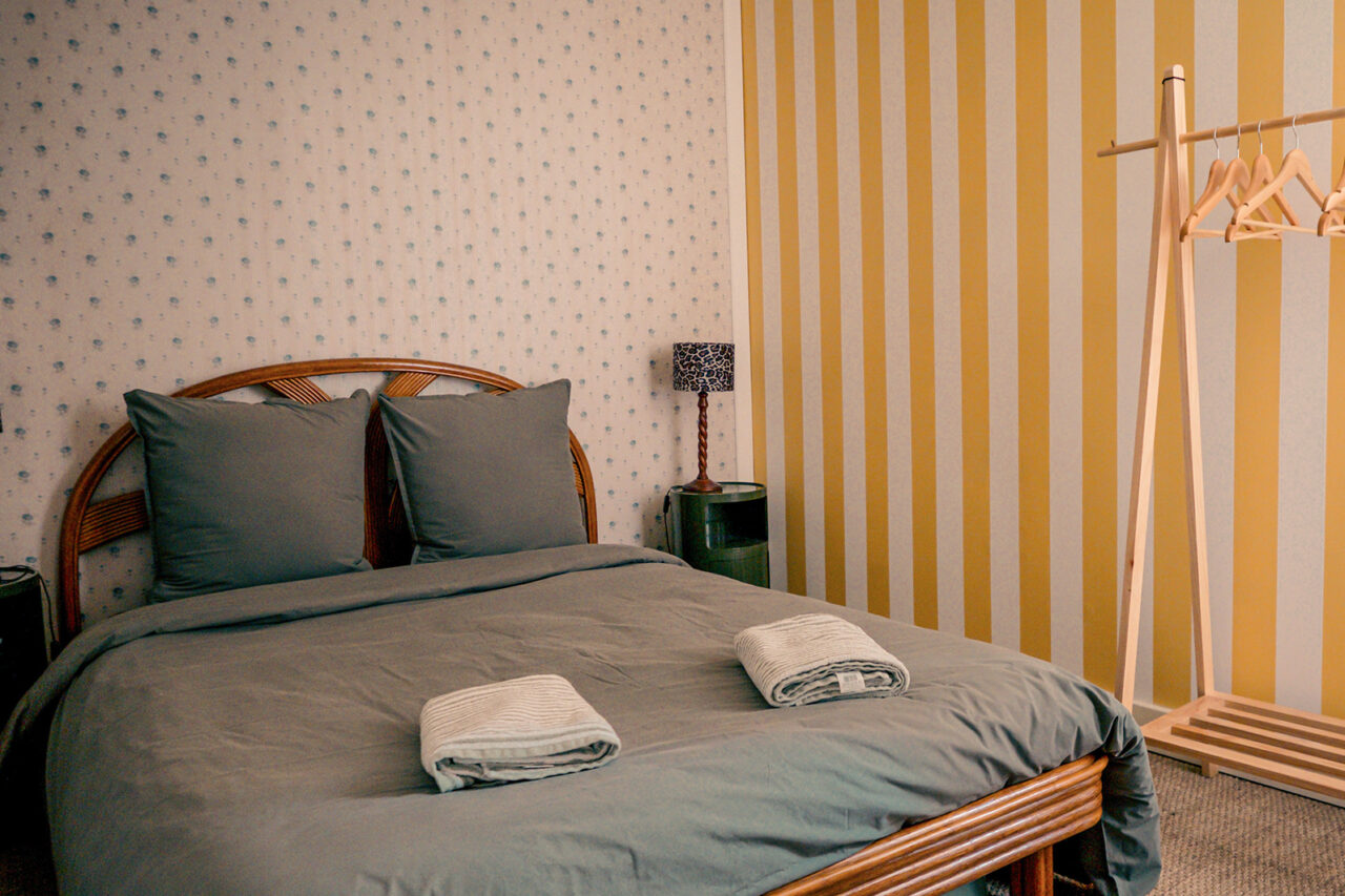 Attention, chambre psychédélique. Mur et plafonds de rayures jaunes se partagent l’affiche avec lit en rotin vintage (140 x 200 cm) et ses tables de chevets de 1967. Dessus, deux abat-jours à motif léopard ...