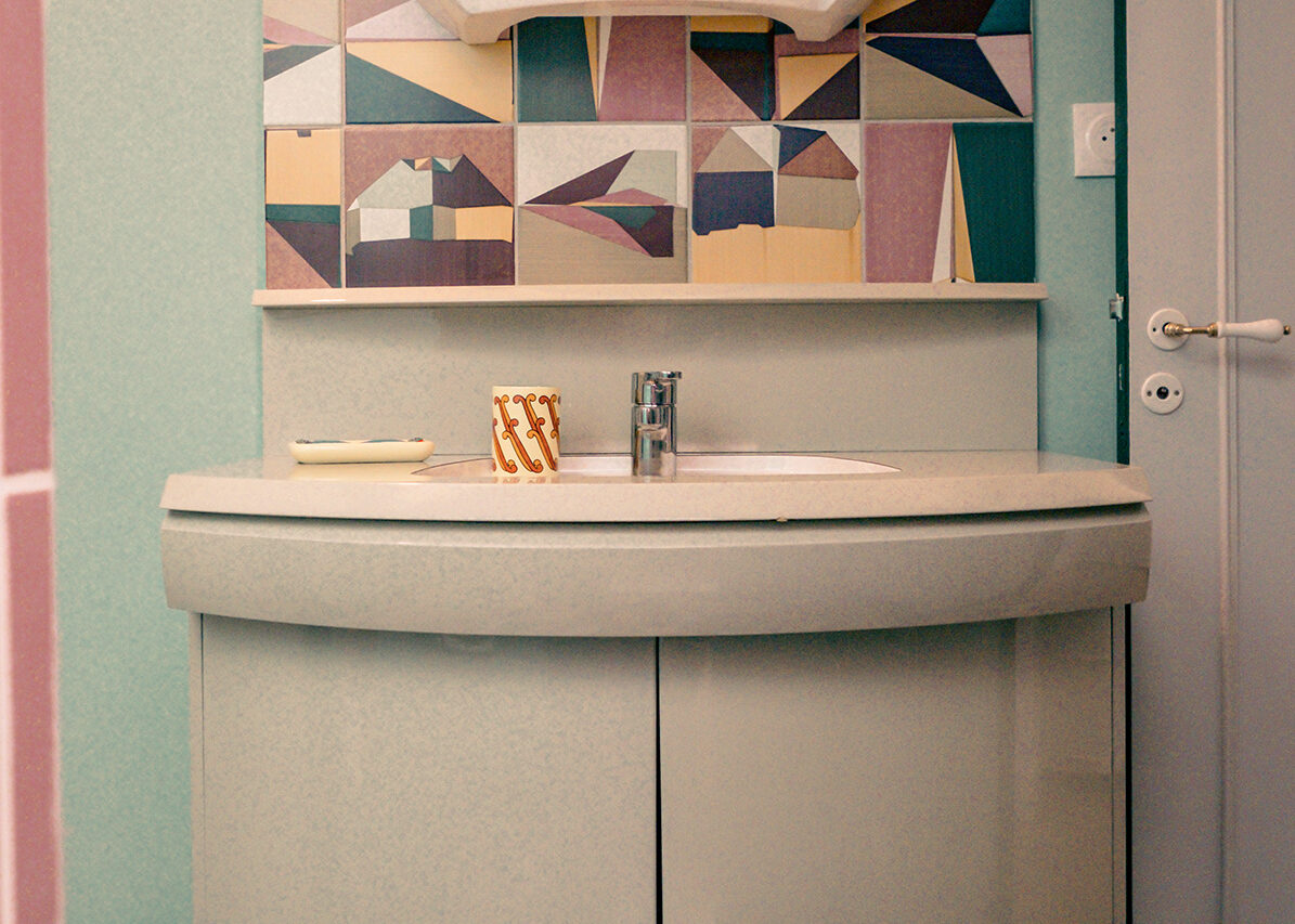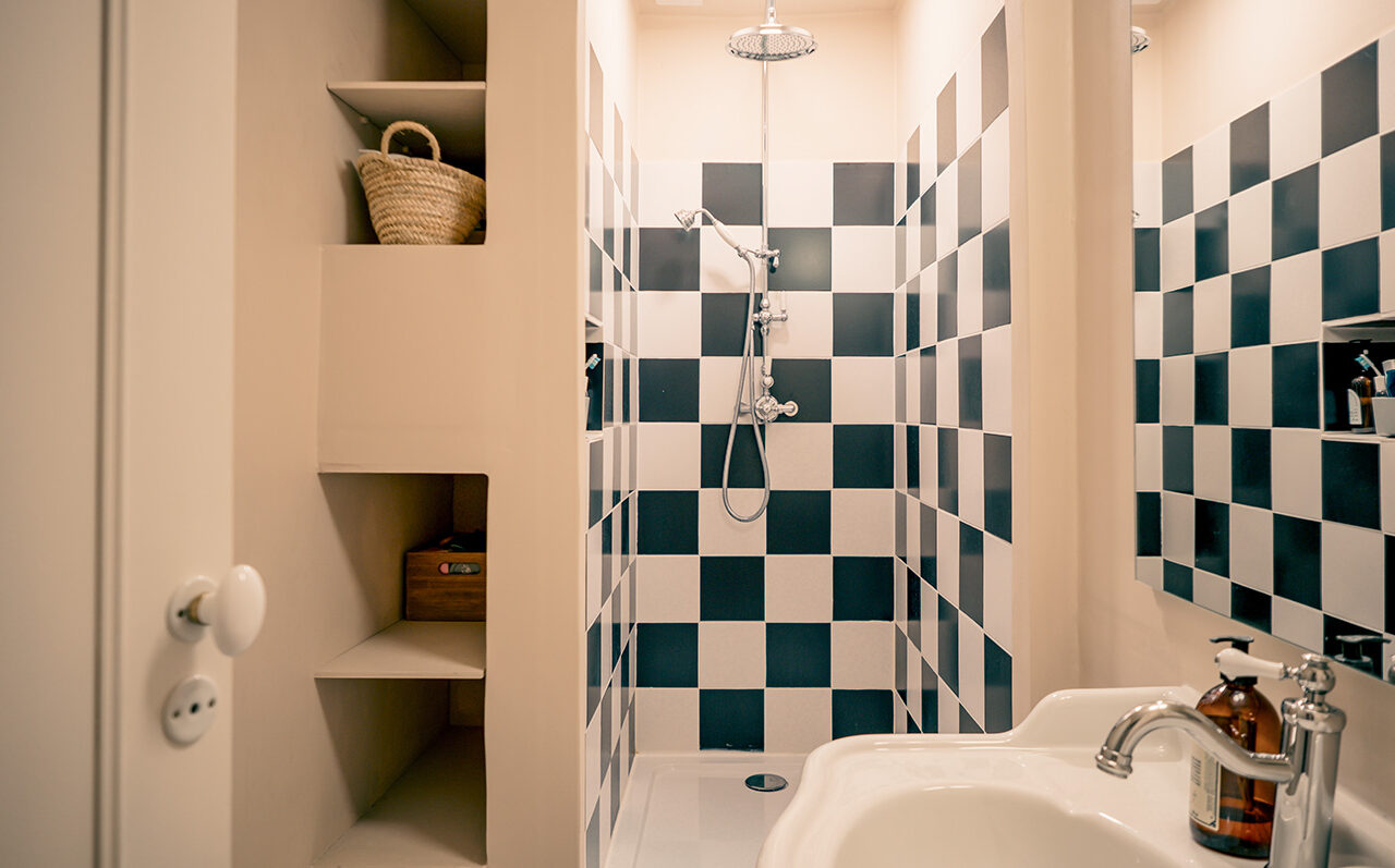 Salle de bains en damier noir et blanc avec son lavabo et sa douche, le strict minimum pour un maximum d’efficacité. Et c’est joli ! En face, un lave-linge qui fait aussi sèche-linge ...