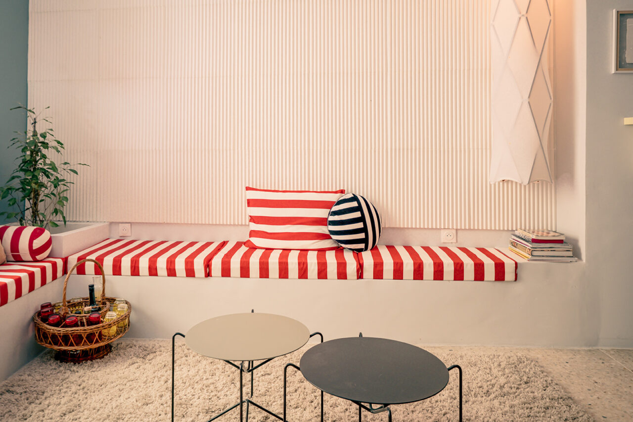 Un espace ouvert où des banquettes font office de canapé pour rassembler. Au sol, un tapis accueillant où on se prélasse aisément et quelques tables d’appoint pour l’apéro ou les parties de jeu de cartes. ...